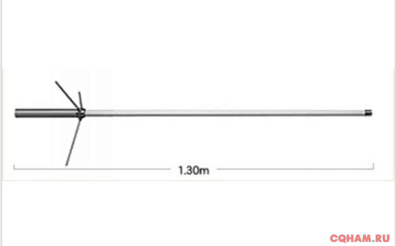 Антенна имеет размеры в высоту - 1,3 метра, и технические характеристики: КСВ - не более 1,2, усиление 3 дБ на 144 МГц и 4 дБ на 430 МГц, сопротивление 50 Ом Разъем UHF (PL-259)