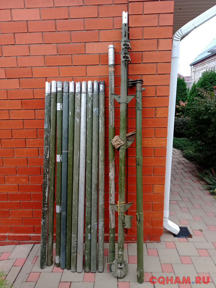 Мачта составная рaдиостaнции P-405. Подьемник из двух частей, 10 колен диаметр 55 мм длиной 1,6м и верхнее деревянное колено 2м . Высота мачты18 метров.