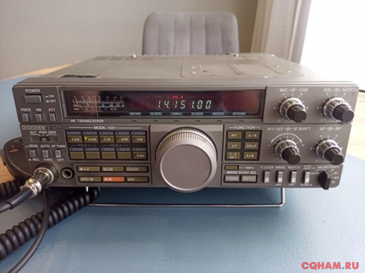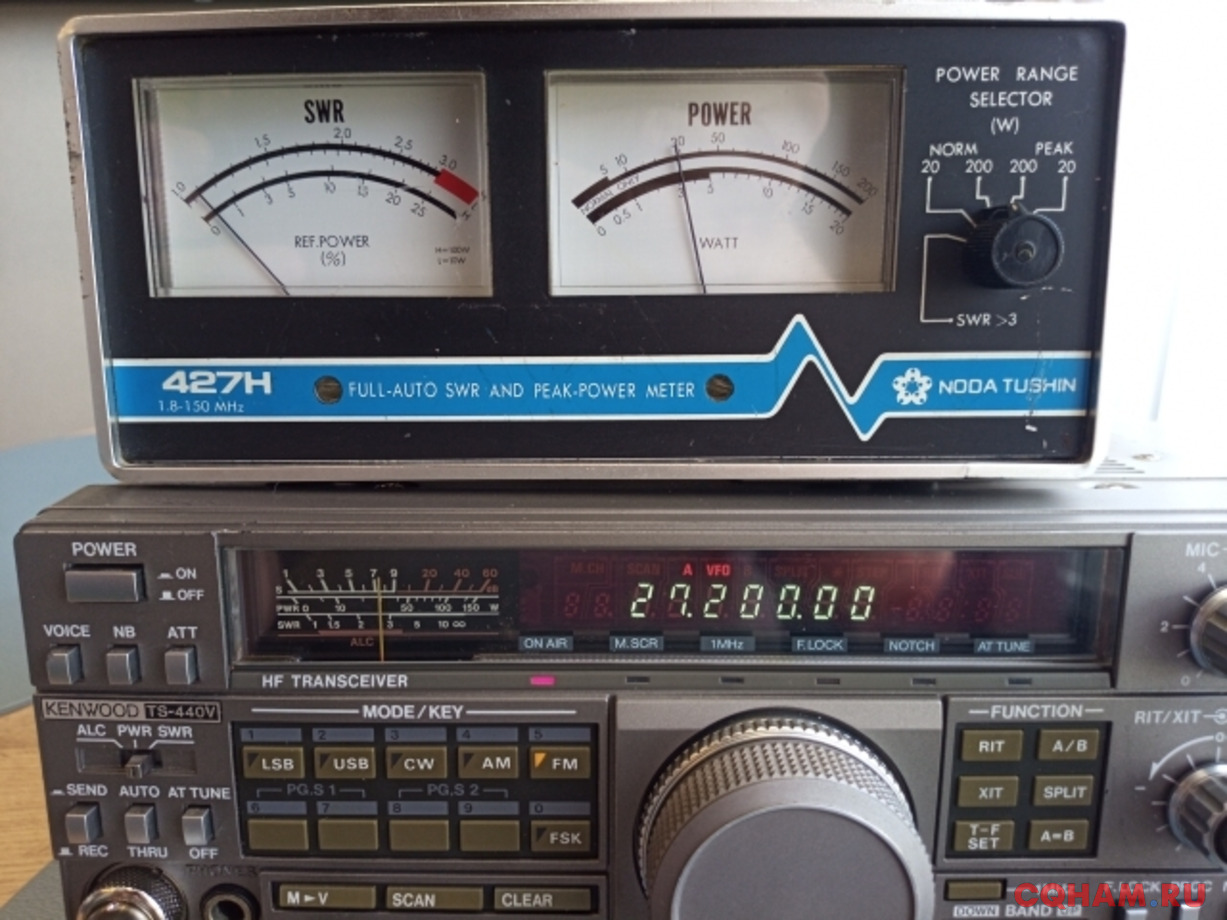 Kenwood TS-440V, классический японский трансивер, имеет автоматический антенный тюнер, замеренная мощность на всех диапазонах около 30Вт.